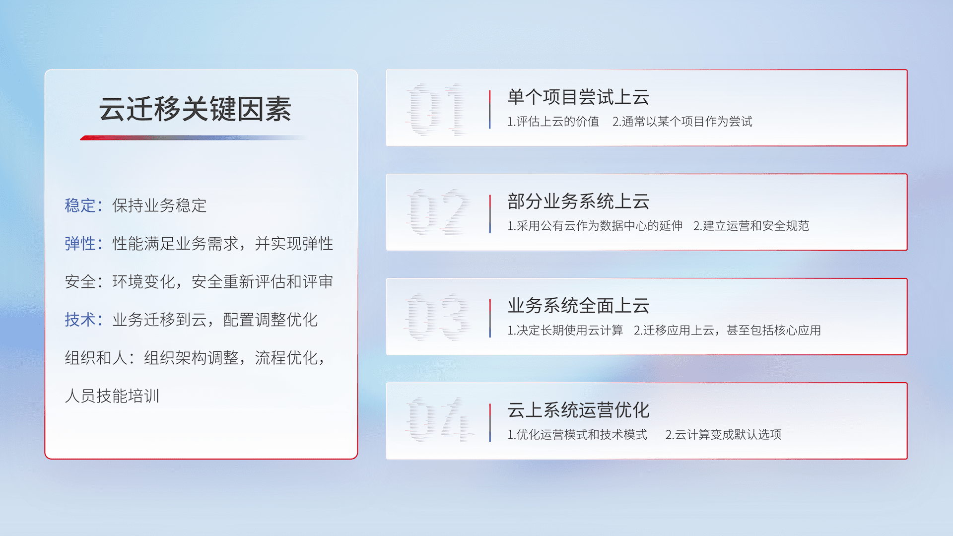 结合实际业务,,从规划设计、、、、云平台选型、、云原生改造、、、数据迁移、、、、集成交付,,,迁移全过程为客户识别最佳上云路径,,做好风险识别管理,,,,设计网络架构、、身份权限、、安全审计合规、、、、操作审计、、、、日志审计、、、监控告警策略、、、、多站点容灾设计等,,对云上基础设施进行整体规划,,,,提升IT治理水平,,,以满足弹性、、、、高可用、、高性能的需求。。