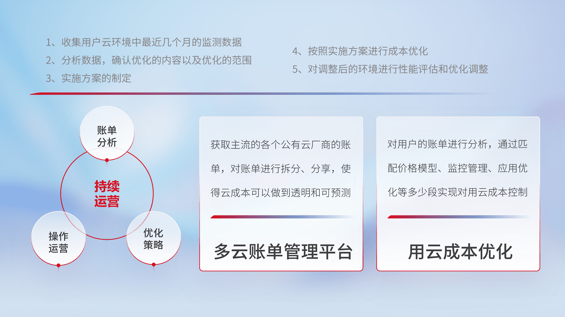 通过多云纳管,,以统一的资源数据模型把客户的云资源进行抽象和封装,,,,进而实现对多云资源的统一操作,,,保障云资源管理的可靠性、、稳定性与可用性。。量身定制化运维内容,,,配置、、、、开发运维、、、补丁管理、、、备份、、、、监控、、、认证和访问管理、、、审计和日常巡检等,,,保障在用云过程中的可靠度,,稳定度以及高可用率。。。